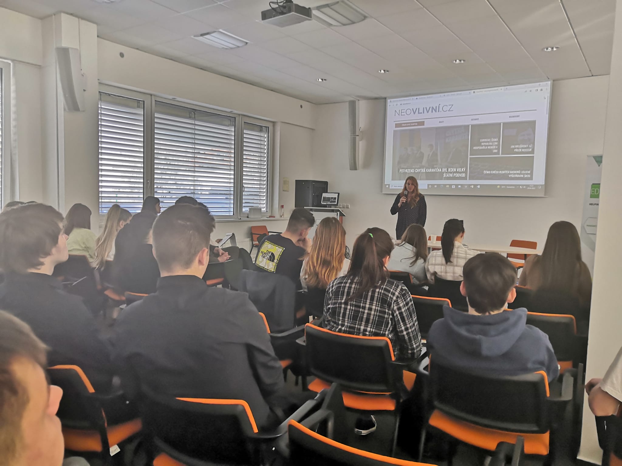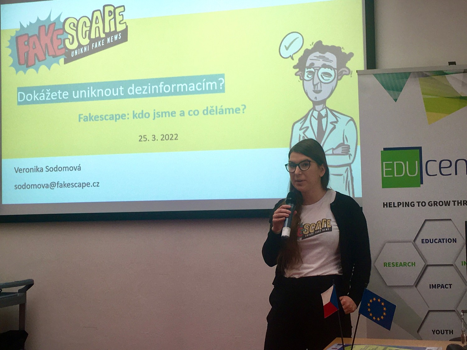 O mediální gramotnosti a fake news byla řeč v příspěvku Veroniky z Fakescape, což je studentský spolek zabývající se bojem s fake news a dezinformacemi, palčivým problémem dnešní doby. Poutavou formou a s pomocí technologií, které jsou mezi studenty často lákadlem, s publikem rozebírala téma, zda opravdu dokážeme v dnešní době uniknout dezinformacím. Někteří jsme byli překvapeni, jak je opravdu těžké intuitivně rozhodnout, že se jedná o pravdivou informaci či nikoliv. Naštěstí jsme se seznámili s nástroji, které nám v úsudku můžou pomoci.