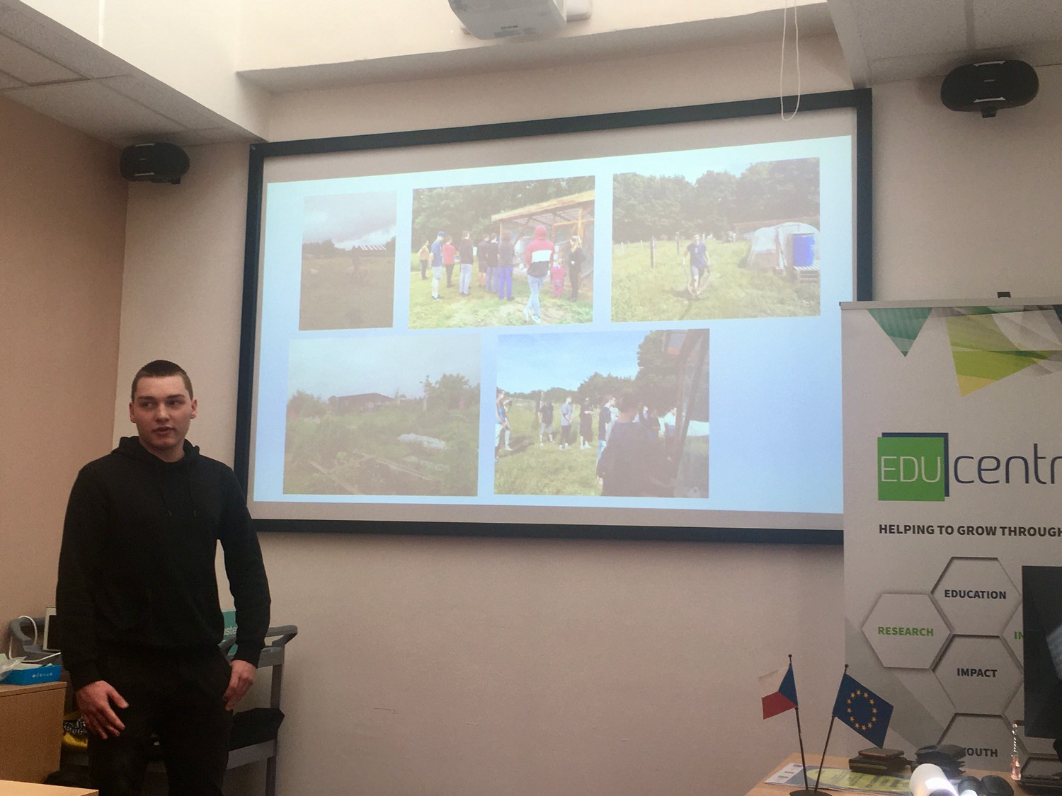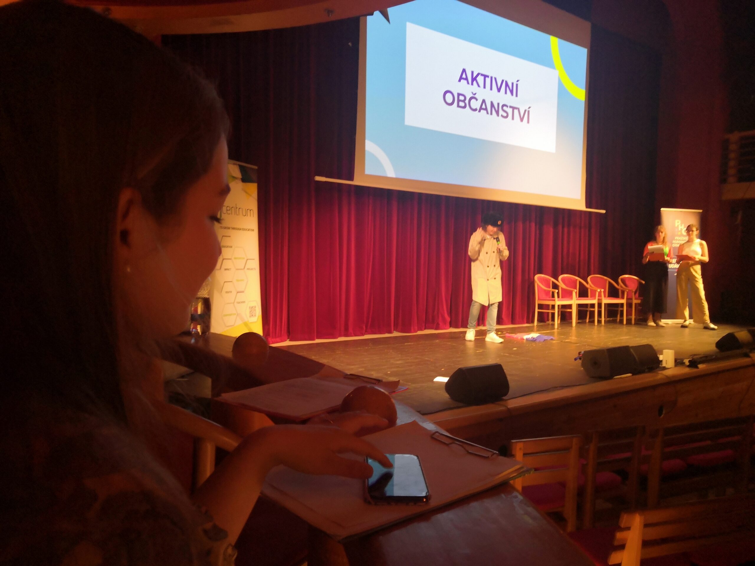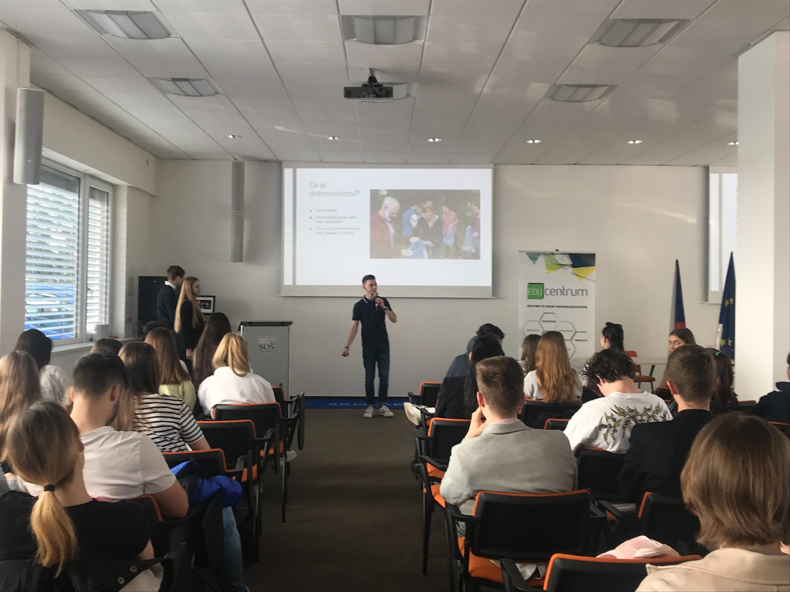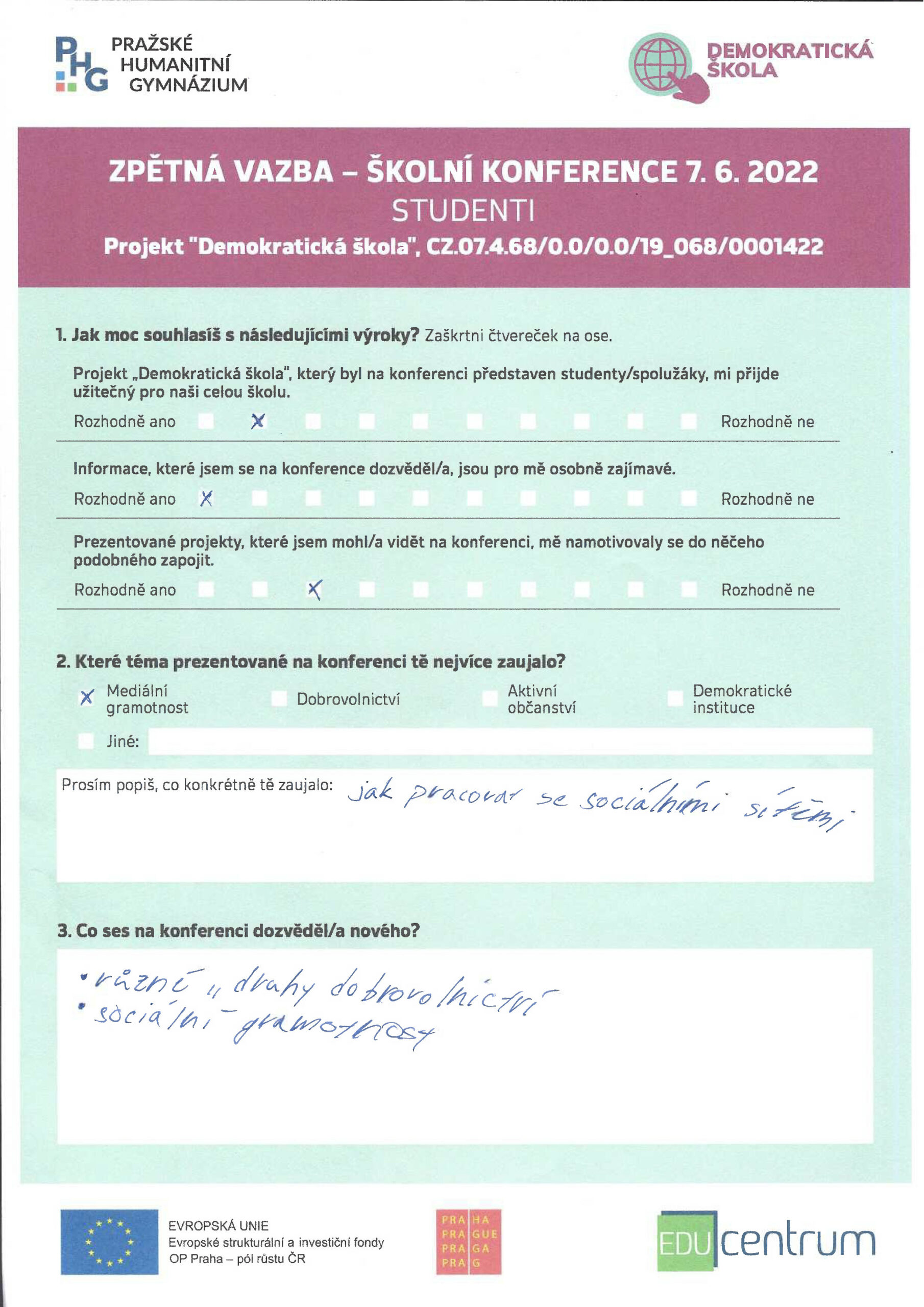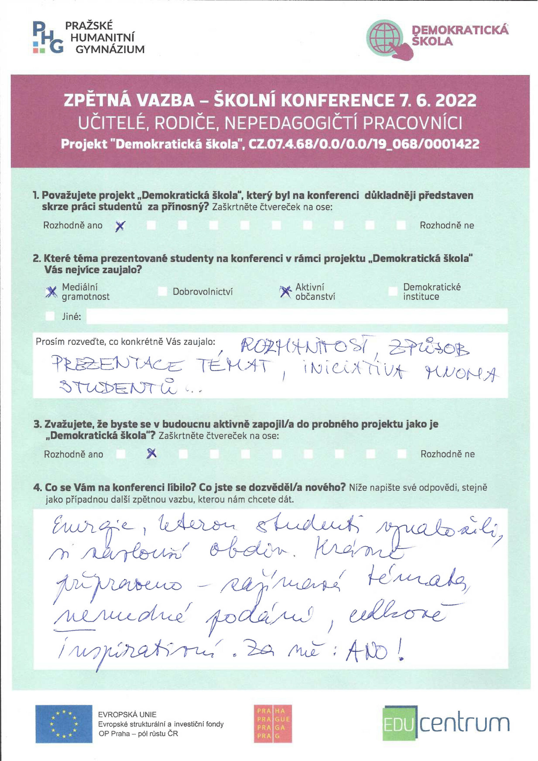 Konferenci slavnostně zahájil pan ředitel, který poděkoval všem zúčastněným a vyzdvihl přínos projektu pro komunitu školy. Následovala série prezentací, které si mezi sebou rozdělili studenti zapojených tříd, a interaktivním způsobem představili stěžejní témata projektu – dobrovolnictví včetně vlastních zkušeností z pomoci na MÚ a v Domě seniorů v Horních Počernicích a v Dětském domově v Dolních Počernicích, aktivního občanství, demokratických institucí jako OSN nebo Amnesty International a dezinformací a fake news. Své prezentace prokládali kvízy na populární platformě Kahoot, takže měli příležitost zapojit se i méně výřeční účastníci konference.